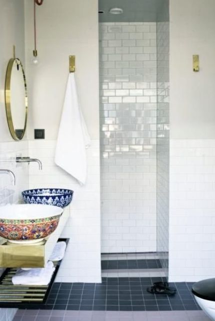 Aquí vemos una curiosa combinación de dos lavabos de cerámica decorada con motivos y colores diferentes. Una buena idea para crear una parte femenina y otra masculina en el baño. Con cuidado de que, como vemos aquí, el resto del baño se mantenga lo más neutro y minimalista posible.