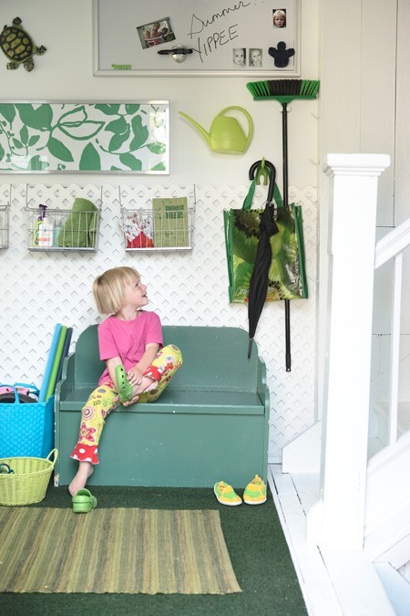 En este vestíbulo se ha creado un ambiente de jardín, con un banco pintado en verde y toda una serie de complementos del mismo color pero en distintos tonos. Con diversos soluciones de almacenaje para tenerlo todo controlado.