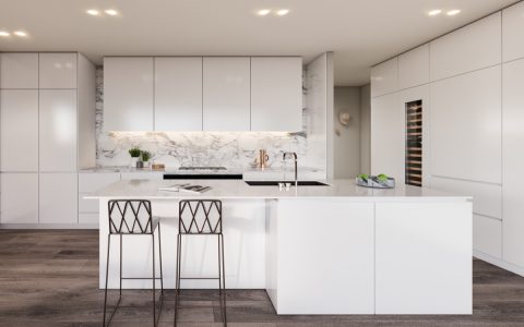 Si estás buscando un diseño moderno de una cocina blanca, esta seguramente te encantará, Una isla de mármol blanco y una encimera negra, junto con taburetes y gabinetes negros crean un espacio sofisticado.