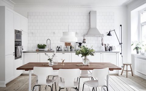 Esta cocina blanca de diseño escandinavo presenta un protector contra salpicaduras de azulejos blancos que imitan al ladrillo y paneles de gabinete grises con perillas blancas. La encimera de madera coincide con la mesa que se combina con bancos de madera.