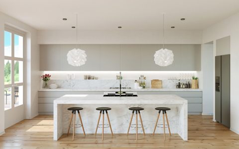 Esta cocina blanca y gris usa mármol en la isla y protector contra salpicaduras. Las lámparas colgantes de flores proporcionan decoración e iluminación ambiental.