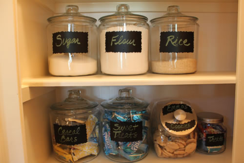 Se almacenaron diferentes alimento en botes transparentes decorados con vinilo de pizarra sobre el que se rotuló los nombres de los distintos contenidos.